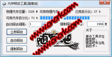 Win7內(nèi)存釋放工具立即釋放,自動(dòng)釋放,強(qiáng)制釋放 三種功能,如果你的電腦內(nèi)存卡死,強(qiáng)制釋放,平時(shí)優(yōu)化電腦建議開(kāi)啟自動(dòng)釋放[軟件會(huì)自動(dòng)最小化]