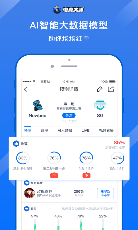 電競大師是為廣大電競愛好者提供的電競賽事分析,預(yù)測的數(shù)據(jù)平臺。并有國內(nèi)知名戰(zhàn)隊(duì)成員,主播進(jìn)行賽事比分預(yù)測。