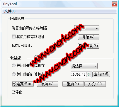 如果是自動從路由器取得的IP地址就不用選那個復(fù)選框。也有手動修復(fù)的按鈕。本軟件還附帶自動關(guān)機(jī),定時關(guān)機(jī),重啟等多個功能。