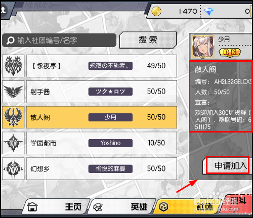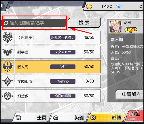 也可在上方搜索社團(tuán)的名字或者編號(hào),搜索出來后,點(diǎn)擊申請(qǐng)加入即可,如圖所示