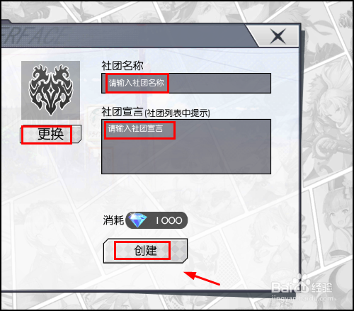 如果前面兩個(gè)條件滿足,就可以創(chuàng)建社團(tuán)了,更換頭像,輸入社團(tuán)名字和宣言,點(diǎn)擊創(chuàng)建即可,如圖所示