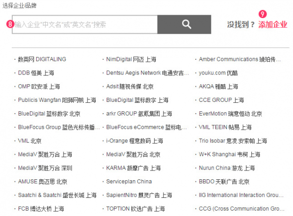 (如上圖 5) 點(diǎn)擊“ + ”添加品牌,(如下圖 8)彈出品牌選擇頁面。輸入企業(yè)“中文名”或“英文名”查找,如果多次搜索后無結(jié)果,請點(diǎn)擊“添加企業(yè)”(如下圖 9)。