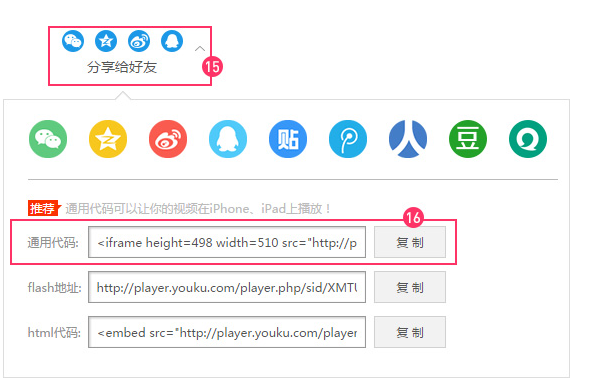 點(diǎn)擊(如上圖 13)彈開(如下圖14),然后從騰訊、土豆、愛奇藝等其它視頻平臺(tái)的視頻頁面,找到分享(如下圖15),點(diǎn)擊彈開找到“通用代碼”(如下圖16)復(fù)制,然后,回到如下圖(如下圖14)粘貼進(jìn)去,點(diǎn)擊確定按鈕。