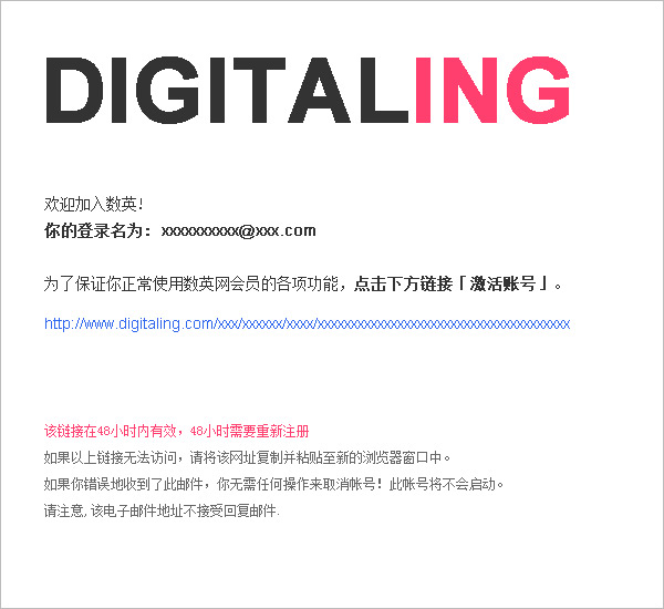 (3) 打開您的個(gè)人郵箱 (注冊時(shí)候填寫的郵箱),收到數(shù)英網(wǎng)注冊成功郵件(如下圖) (可能會(huì)在垃圾郵箱里面),點(diǎn)擊"激活帳號(hào)"鏈接,并完善個(gè)人資料。
