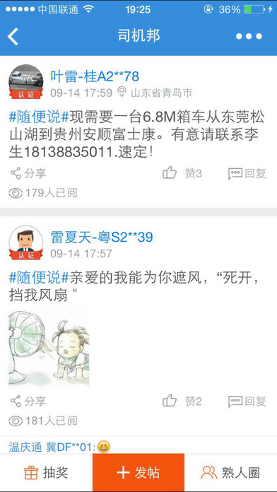 4.司機(jī)邦-貨車司機(jī)網(wǎng)上家園 每次貨運(yùn)都是一次旅途。有事兒沒事兒,大家都來說說,貨車司機(jī)網(wǎng)上心靈家園。每天(上午10點(diǎn)。下午16點(diǎn)整)貨車司機(jī)還可以免費(fèi)搶大禮哦!
