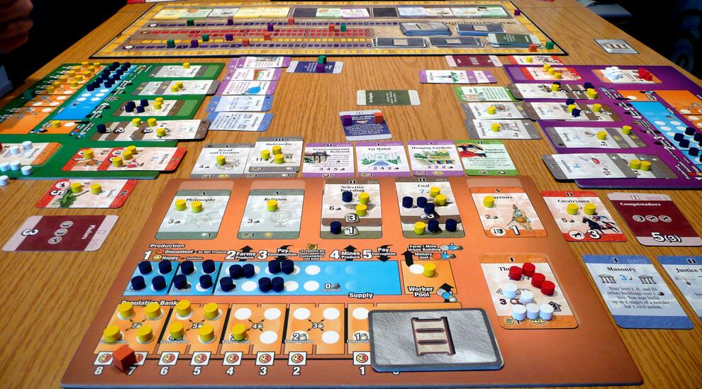 歷史巨輪將文明的各種元素簡化、整合了起來,玩家要在3個時代接近20回合的角逐中,招募偉人、建造奇跡、發(fā)展基建、訓(xùn)練部隊、開拓殖民,時刻關(guān)注自己的科技、文化、農(nóng)業(yè)、工業(yè)、政體、軍事、幸福度等指標(biāo),迎接一系列未來的不確定性事件,時刻準(zhǔn)備發(fā)起戰(zhàn)爭或抗戰(zhàn)。多人局還要兼顧外交關(guān)系,簽署外交協(xié)議。大家還記得和《文明》類似的桌游《歷史巨輪》(Through the Ages)嗎?