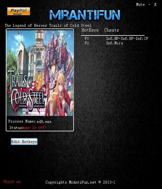 英雄傳說閃之軌跡四項修改器是由MrAntiFun制作并分享的同名游戲輔助工具,英雄傳說閃之軌跡修改器具備無限HP,EP,CP,Mira(金錢)這四項修改器功能,能夠幫助用戶更好的體驗游戲。