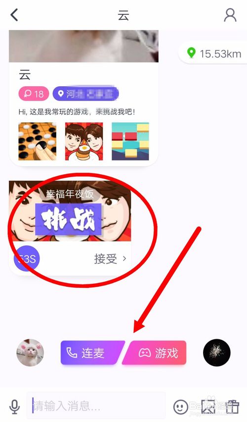 匹配成功后就會進入聊天對話界面,我們可以點擊游戲選擇一款游戲讓對方接受,也可以選擇接受對方的游戲邀請進行游戲。當然我們也可以進行下方 的聊天或者連麥。