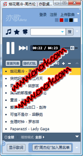 亦歌桌面版 V1.3 簡體中文綠色免費版 亦歌air桌面版它利用AIR技術(shù)實現(xiàn)跨平臺,除了亦歌的所有功能外,還通過系統(tǒng)托盤提供播放/暫停、下一首、顯示模式切換等基本功能。亦歌播放的歌曲鏈接來源于互聯(lián)網(wǎng)。系統(tǒng)進行了高強度的篩選,保證絕大多數(shù)歌曲可以正確播放。如果您有一邊在電腦上工作、娛樂一邊聽音樂的習(xí)慣,亦歌希望成為您首選的聽歌工具。需要安裝Adobe AIR才能運行