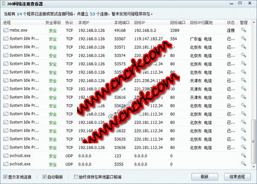 360網(wǎng)絡(luò)連接查看器是360安全衛(wèi)士組件之一。可以查看正在運行的所有網(wǎng)絡(luò)連接,甚至地理位置都直接可以顯示出來??梢宰鳛橐粋€有效的查毒查木馬的輔助工具。