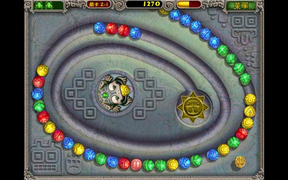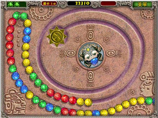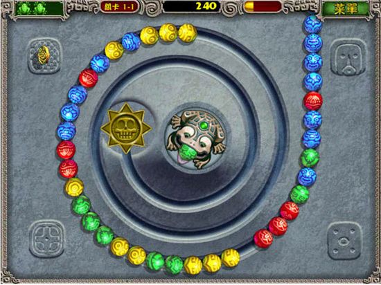 青蛙祖瑪游戲主角是一只石青蛙,它會吐出各種顏色的小球。小球造型美麗并且有著神秘的色彩,環(huán)繞著石青蛙的是載著小球的軌道,各種顏色的小球會沿著軌道向前滑動。石青蛙阻止小球滾進(jìn)軌道終點的洞里的方法就是用吐出小球與軌道上的小球相結(jié)合,顏色相同且數(shù)量達(dá)到三個以上就會消除得分。屏幕右上方有一個分?jǐn)?shù)格。當(dāng)達(dá)到一定分?jǐn)?shù)(黃色的氣滿)的時候游戲中會聽到“ZUMA”的聲音,然后所有小球倒退若干步。這是一個表面現(xiàn)象,這個分?jǐn)?shù)格最重要的作用是表示該版的結(jié)束,當(dāng)“ZUMA”叫出后,就不會再增加小球了,也就是說消除完眼前的所有小球就能過關(guān)了。