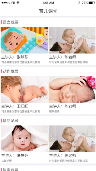 3.育兒課堂 ------ 語言發(fā)展、動作發(fā)展、情商發(fā)展、智商發(fā)展、藝術發(fā)展、國學育兒、創(chuàng)意育兒、閱讀育兒、安全育兒、美德育兒、科普育兒、習慣育兒、胎期教育、營養(yǎng)保健等。