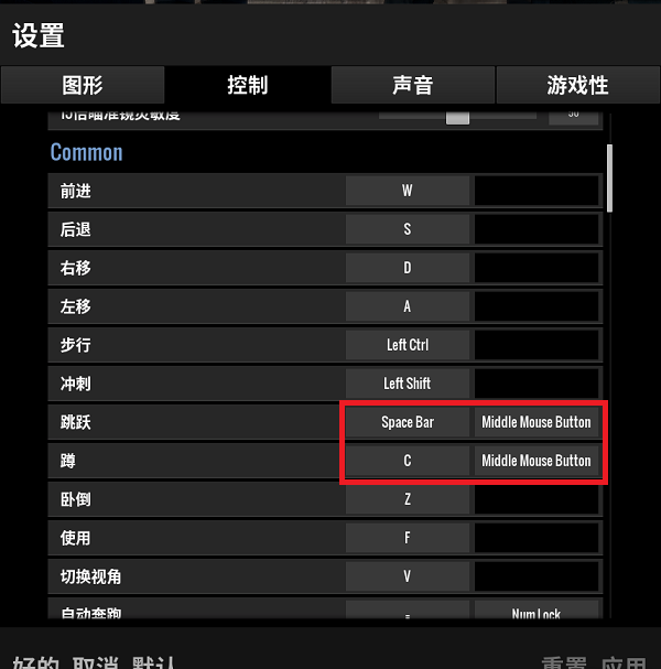 在我的設(shè)置中,我將跳躍動作同時設(shè)定為空格/Ctrl,并且我的蹲下為Ctrl/C,這符合原理所講的“跳+蹲”同時按。