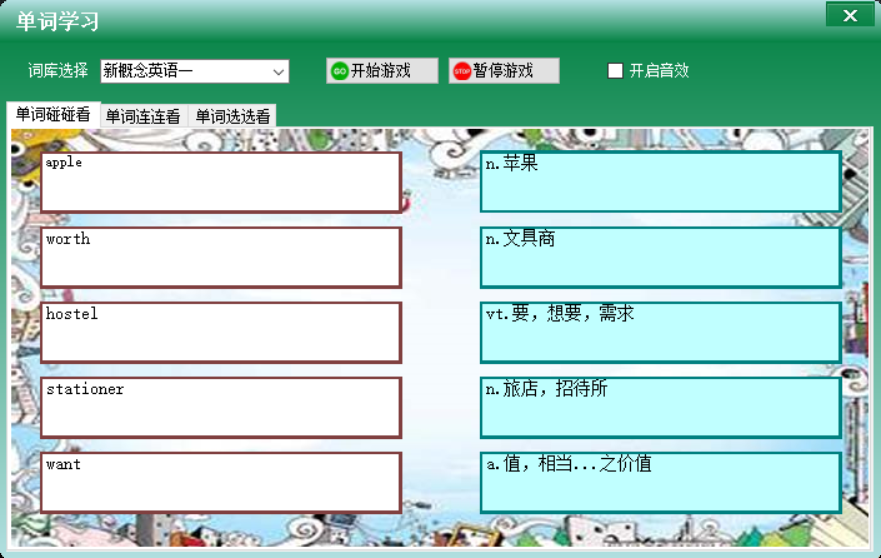 主要是單詞碰碰看、連連看、選選看游戲。在游戲的同時(shí),進(jìn)一步加深對(duì)英語(yǔ)單詞的記憶效果,一舉兩得。