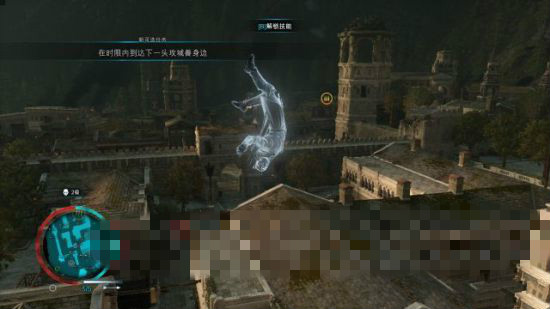 在外墻飄飾移動(dòng)到半獸人指揮官頭頂?shù)睦K索上,落到繩索后,再繼而對(duì)指揮官施展空中暗殺。