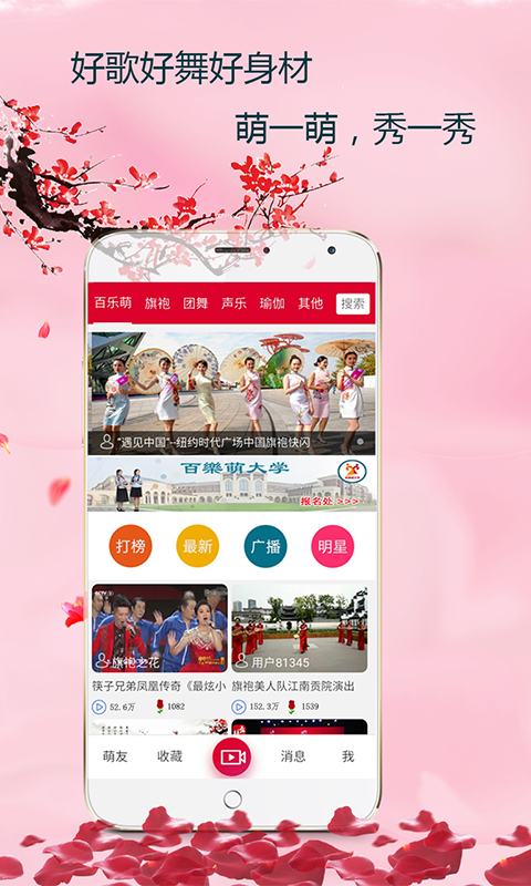 1.旗袍秀、團(tuán)舞、瑜伽、聲樂等領(lǐng)域的觀看、拍攝、分享、學(xué)習(xí)平臺(tái);2.百樂萌大學(xué)提供專業(yè)的在線直播教育平臺(tái);