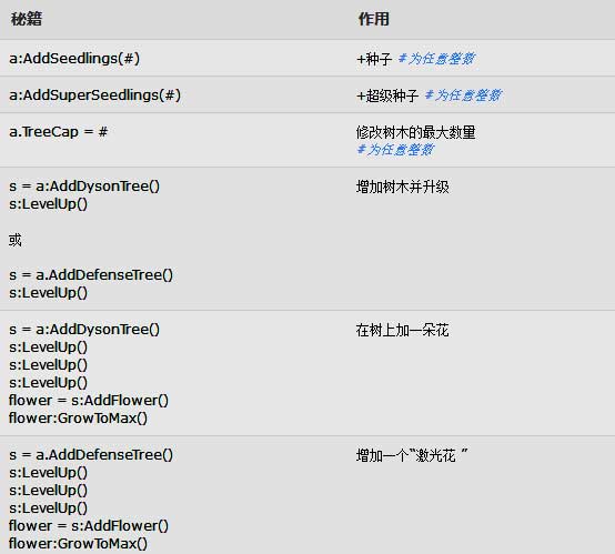 s=a:AddDysonTree()增加樹木并升級(jí)