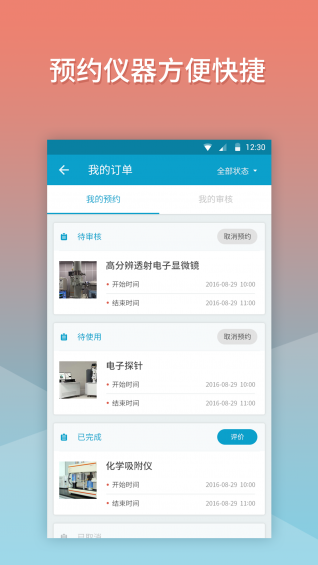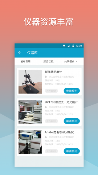 大儀共享是物聯(lián)網(wǎng)化的實(shí)驗(yàn)室儀器預(yù)約使用APP,分普通用戶、儀器管理員、超級管理員等不同角色提供對應(yīng)的功能,從儀器預(yù)約到審核然后到使用到完成評價(jià)的一系列儀器使用管理,方便用戶實(shí)現(xiàn)儀器的定時(shí)預(yù)約及全面管理,全面實(shí)現(xiàn)實(shí)驗(yàn)室智能化追溯管理。