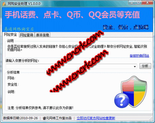 網(wǎng)購安全助理 V1.2.0.0 簡體中文綠色免費版 它內(nèi)置了幾百家購物安全網(wǎng)站的信息以及部分釣魚網(wǎng)站黑名單,能對給定的網(wǎng)址進行比對。對于數(shù)據(jù)庫中找不到的網(wǎng)站信息,它還能智能分析相似度,判定是否為釣魚網(wǎng)站。同時網(wǎng)址安全數(shù)據(jù)庫每周更新,防范最新釣魚網(wǎng)站。