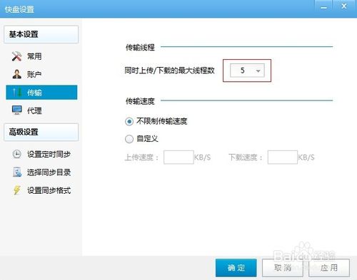 選擇基本設(shè)置【傳輸】,這里有兩個(gè)可以設(shè)置的地方,傳輸線程,建議設(shè)置為一個(gè)合適的數(shù)值,如筆者這里設(shè)置為5,合適的線程可以限制連接數(shù)。