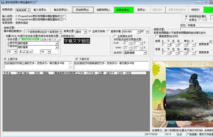 度彩視頻畫(huà)中畫(huà)批量制作工廠,用于將前景視頻跟背景視頻進(jìn)行畫(huà)中畫(huà)模式融合,同時(shí)提供添加上部或下部文字水印功能,適合自媒體個(gè)人/單位等使用。【功能介紹】