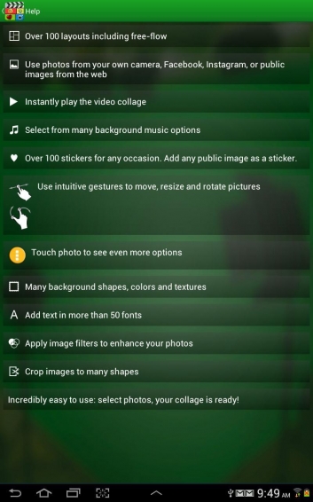 選擇照片,共創(chuàng)美好的簡短視頻拼貼畫(照片網(wǎng)格)。視頻或照片保存無論是照片拼貼或視頻拼貼易于使用??焖俸椭庇^定制:音軌幻燈片樣式拼貼布局100預(yù)定義或創(chuàng)建您自己的。貼紙100貼紙。使用圖像搜索導(dǎo)入更多。文字55不同的字體背景過濾器增強(qiáng)您的照片照片或視頻保存高分辨率的高清照片到手機(jī)的畫廊,或高分辨率的MP4視頻已很多照片來源相機(jī)圖片,社交網(wǎng)絡(luò),或在網(wǎng)絡(luò)上搜索圖片。分享你與他人建立視頻拼貼畫。修改重新編輯拼貼的任何時(shí)間。