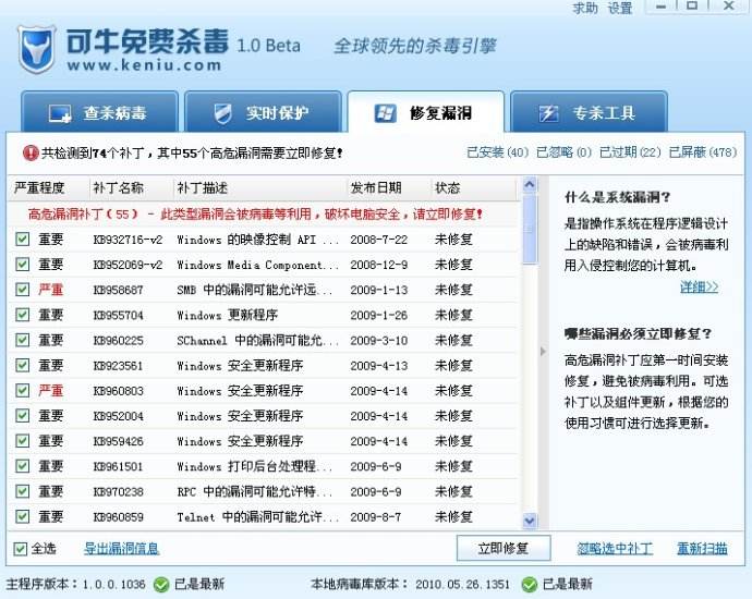 可牛免費(fèi)殺毒是一款專(zhuān)業(yè)的病毒查殺軟件,它采用自主研發(fā)的殺毒引擎,可以對(duì)電腦進(jìn)行全盤(pán)檢測(cè),能夠快速將隱藏在系統(tǒng)深處的病毒查找出來(lái),并對(duì)病毒文件進(jìn)行清除??膳C赓M(fèi)殺毒還具有強(qiáng)大的病毒防護(hù)能力,能夠?qū)崟r(shí)保護(hù)系統(tǒng)不被病毒木馬入侵??膳C赓M(fèi)殺毒功能十分豐富,它還提供修復(fù)漏洞功能,可以幫助用戶將系統(tǒng)中的高危漏洞進(jìn)行修復(fù),使系統(tǒng)漏洞不被病毒利用。