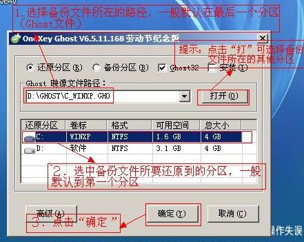 2、這步為還原系統(tǒng)重要的一步,請認(rèn)真選擇。首先選擇備份文件所在的分區(qū),一般默認(rèn)在最后一個分區(qū),是一個Ghost文件(提示:點擊“打開”可選擇備份文件所在的其他分區(qū))。其次選中備份文件要還原到的分區(qū),一般默認(rèn)到第一個分區(qū),大部分是C盤。這兩步選擇好之后點擊“確定”