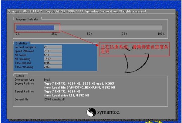 7、現(xiàn)在正在還原系統(tǒng),不需要任何操作請等待藍(lán)色進(jìn)度條走完