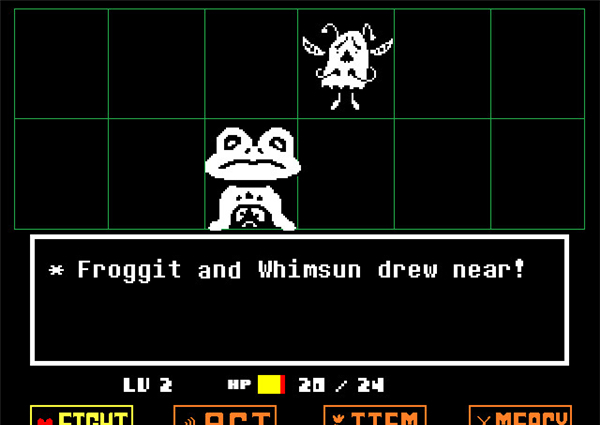 戰(zhàn)斗方框:如果敵人選擇攻擊你(不論你是否選擇主動(dòng)攻擊),在屏幕下方會(huì)出現(xiàn)一個(gè)方框,玩家操控這個(gè)心形對(duì)方框的圖案進(jìn)行躲避,一旦被觸碰就會(huì)受到傷害,某類(lèi)特殊圖案即便是觸碰了也不會(huì)受到傷害(如骷髏的藍(lán)光)。