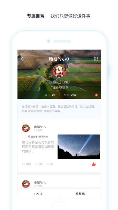 ??ё择{app是一款非常適合旅游愛好者的手機(jī)出行軟件。用戶可以關(guān)注喜歡的頻道、達(dá)人,瀏覽精彩豐富的自駕圖文,同時(shí)也可以隨時(shí)記錄自己的自駕足跡,與他人分享旅途中的美好生活。