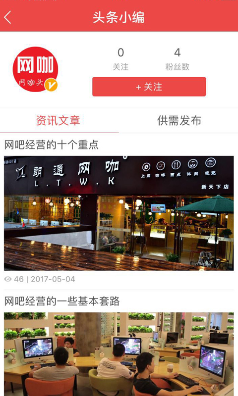 開網(wǎng)咖,上頭條。行業(yè)資訊一網(wǎng)打盡。大咖們一起交流行業(yè)資訊,發(fā)布培訓(xùn)視頻。招聘人才,投遞簡歷。分享裝修風(fēng)格,一起為網(wǎng)咖未來做出努力。