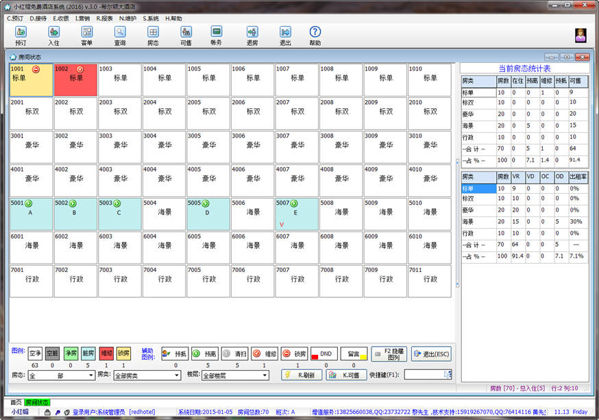 4、形象化的房態(tài)圖顯示,支持主次20余種房態(tài)顯示,支持按樓層、按房型分類顯示,完全符合操作者使用習慣