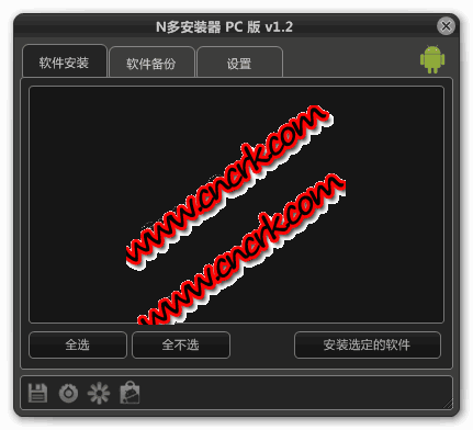 N多安裝器 V1.2 簡體中文綠色免費(fèi)版 N多安裝器(PC版)是一個(gè)集APK文件安裝與備份于一體的PC端便捷工具,幫助Android玩家更加方便自如地安裝和備份APK文件,對(duì)普通玩家來說,提供很簡單很快速的 APK 安裝方式;對(duì)高級(jí)玩家來說, N多安裝器(PC版)開放了插件腳本 API,能隨時(shí)隨地 DIY ,打造一個(gè)完全屬于自己的個(gè)性化 APK 文件安裝器