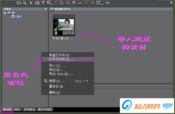 好啦,當(dāng)這些準(zhǔn)備工作都做好之后,我們就來導(dǎo)入視頻素材吧,在右上角的素材庫面板的空白處右鍵,選擇打開文件夾,這個(gè)文件夾就是剛才我們放素材的文件夾啦,然后在右邊就能看到導(dǎo)入進(jìn)來的素材哦。