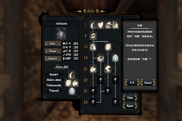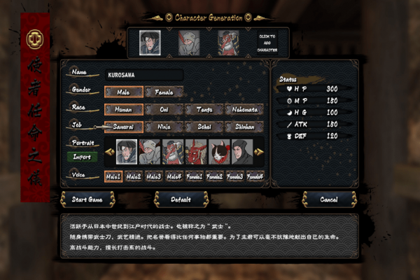 玩家可以從忍者、武士和僧兵等日本傳統(tǒng)職業(yè)中進行選擇。除了人類之外,也可以選擇“鬼”、“天狗”、“貓又”等妖怪種族,他們設有特定的能力值。