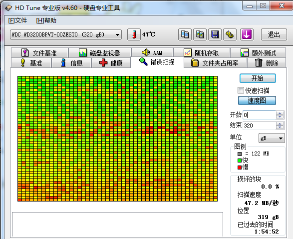2、錯(cuò)誤掃描就是掃硬盤(pán)有沒(méi)有壞道,如果硬盤(pán)上有壞道會(huì)導(dǎo)致系統(tǒng)卡頓死機(jī)這一類的現(xiàn)象。如果有在HD Tune表現(xiàn)就是顯示示紅色的小方塊。正常會(huì)顯示示綠色的方塊