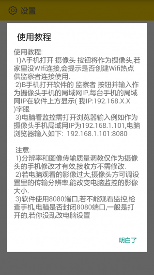 只要設(shè)備(手機(jī),電腦等)在同局域網(wǎng),就可以進(jìn)行視頻監(jiān)控,一臺(tái)手機(jī)作為攝像頭,另一臺(tái)手機(jī)或電腦作為監(jiān)察者,支持多設(shè)備監(jiān)察,手機(jī)端支持拍照功能.