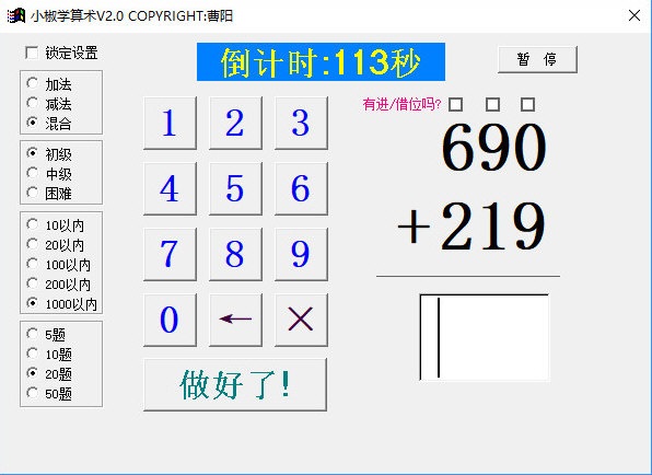 2、可用鼠標(biāo)也可用鍵盤輸入數(shù)字,在不同的難度級(jí)別時(shí)數(shù)字輸入順序不同,如在困難級(jí)別或20以內(nèi)的初級(jí)級(jí)別數(shù)字是從左到右輸入的,其它模式數(shù)字是從右到左輸入的(符合豎式計(jì)算先算個(gè)位再算十位的習(xí)慣)。