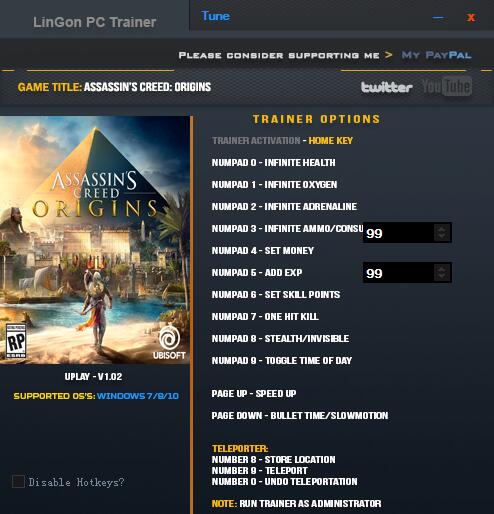 刺客信條:起源 v1.02九項修改器,由“LinGon”制作,具備無限生命,氧氣,腎上腺素,無限箭矢,增加經驗,一擊必殺,隱身等九項修改器功能,本站提供刺客信條:起源修改器,需要的玩家不要錯過哦!【功能介紹】