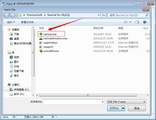 九:運(yùn)行破解補(bǔ)丁會出現(xiàn)如下界面,選中主程序“navicat.exe“,還記得你的安裝路徑嗎,安裝路經(jīng)一般為"C:\Program Files\PremiumSoft\Navicat for MySQL",如果不記得在桌面找到程序圖標(biāo)點(diǎn)屬性進(jìn)行查看。
