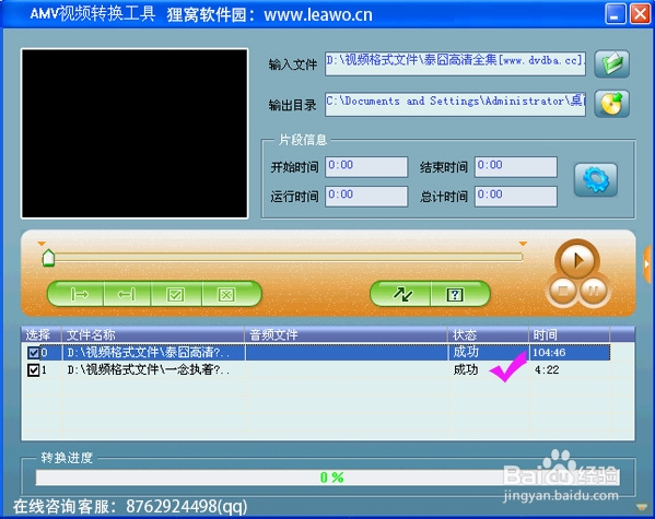 等到轉(zhuǎn)換完成之后,上面提示轉(zhuǎn)換后的狀態(tài)“成功”。這時你就可以在設(shè)置的輸出目錄上找到amv視頻文件添加到播放器上啦。