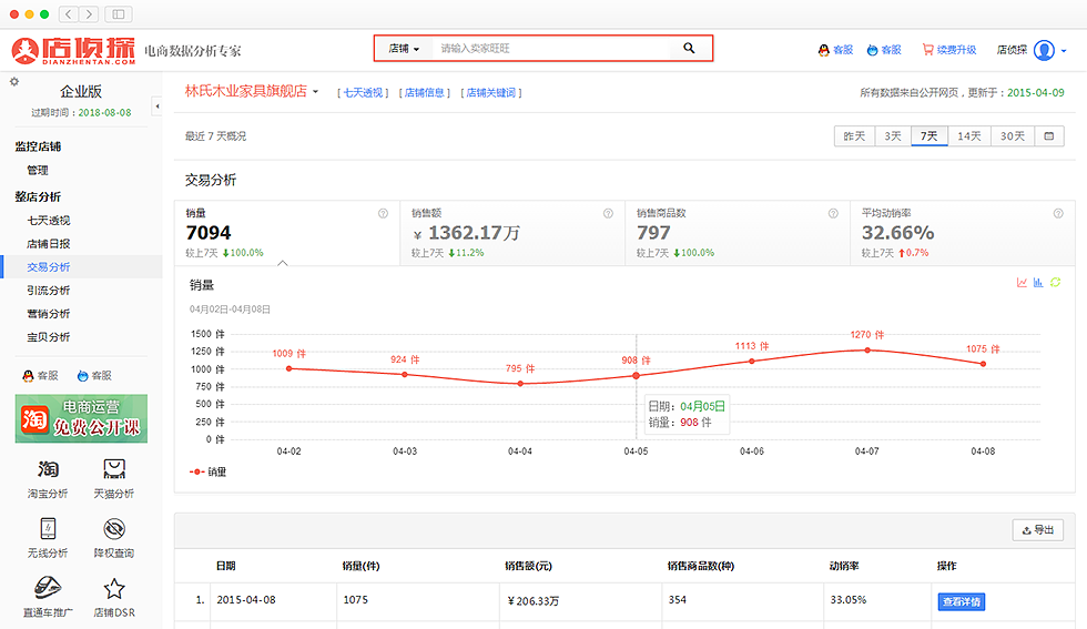 e.查看詳情,查看指定日期此店鋪所有「寶貝每日銷售概覽」(下面有介紹)
