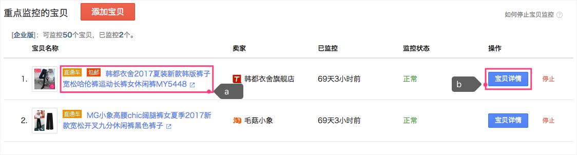 a.寶貝名稱,「直通車」圖標(biāo)表示此寶貝正在用直通車推廣;「包郵」圖標(biāo)表示此寶貝是包郵的