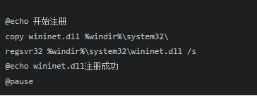通過本網(wǎng)站下載dll的朋友,可將下面的代碼保存為“注冊.bat“,放到dll文件同級目錄(只要在同一個文件夾里面有這兩個文件即可),雙擊注冊.bat,就會自動完成wininet.dll注冊(win98不支持)。