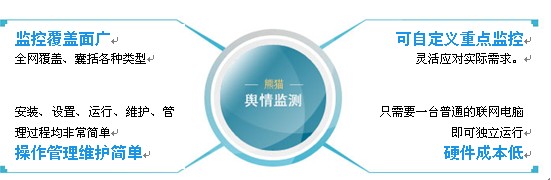 論壇、社區(qū)、博客、貼吧為網(wǎng)民發(fā)表言論提供了陣地,如果缺乏有效的監(jiān)測手段,會造成突發(fā)輿論的大面積傳播,特別是一些負(fù)面言論,會嚴(yán)重影響社會和諧、破壞投資環(huán)境、損害領(lǐng)導(dǎo)威信,這類信息需要及早發(fā)現(xiàn),及時處理。及時了解民眾對于某事件、人物、或者部門的意見,發(fā)現(xiàn)通過正規(guī)渠道難以發(fā)現(xiàn)的信息,以輔助政府制定正確的決策。