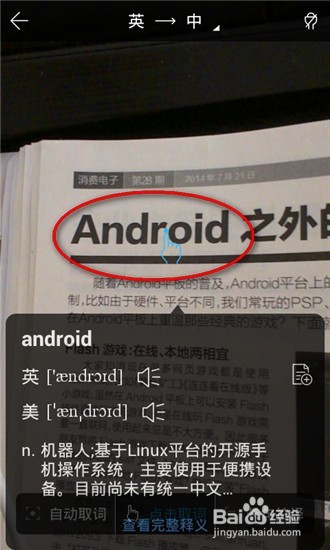 點(diǎn)擊剛才下方的【拍照】按鈕可以切換進(jìn)入拍照取詞的相機(jī)界面,可以通過(guò)【自動(dòng)取詞】、【點(diǎn)擊取詞】、【長(zhǎng)句拍譯】等幾個(gè)功能來(lái)直接對(duì)書(shū)本、雜志上面的單詞或句子進(jìn)行翻譯。