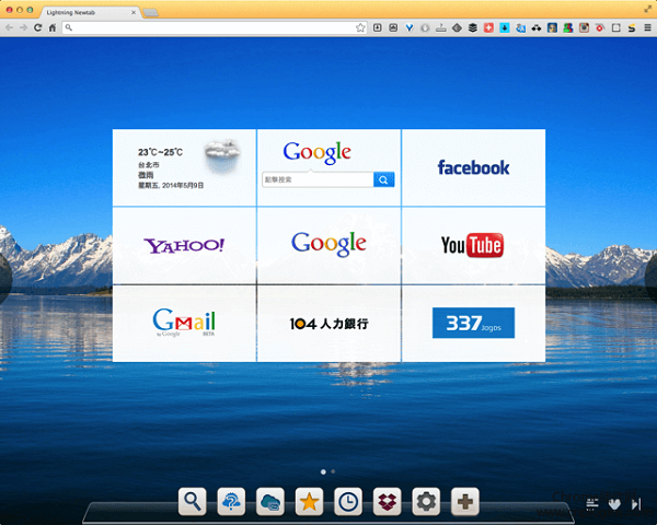 1.LightningNewtab預(yù)設(shè)有八個(gè)網(wǎng)頁可以選擇,包含一個(gè)天氣預(yù)報(bào),還有網(wǎng)頁搜尋功能,點(diǎn)選下方的設(shè)定鈕可自行變換,把自己常用的網(wǎng)頁加入首頁畫面。2.點(diǎn)選天氣預(yù)報(bào),如果不是你的所在地區(qū),可按一下城市旁邊的定位圖示,輸入你的地區(qū)名稱,來顯示該地區(qū)的天氣。