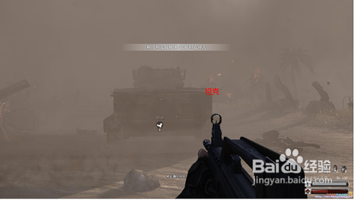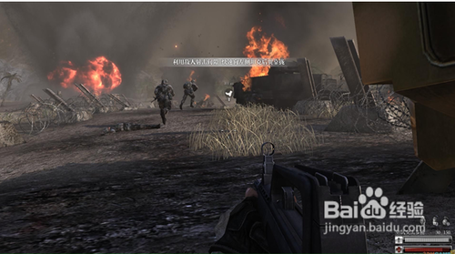 跑到坦克后面安全區(qū),按6掏出定位器,慢慢向左移動,然后瞄準(zhǔn)光標(biāo)處,按鼠標(biāo)左鍵,然后耐心等一會就會有炮火炸掉碉堡(這里要注意,敵兵是無限刷的,所以不要浪費你的子彈),炸掉碉堡后,根據(jù)提示往右邊沖刺,再次進入壕溝。
