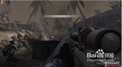 沿著壕溝一路前行,到達火箭筒處,首先干掉左前方障礙里的兩個敵人。換上狙擊槍,然后稍微往左移動一點,以能看到前方火箭筒手為準(zhǔn),然后果斷擊斃火箭筒手,就可以繼續(xù)推進了。